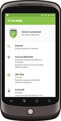 Comprehensive protection for mobile devices from all types of malicious software used by fraudsters to commit cybercrimes. Protection components: anti-virus, Parental control, Calls and SMS filter, anti-theft, firewall, URL filter, Security Auditor. The users of Dr.Web Security Space are entitled to use Dr.Web for Android FREE OF CHARGE.