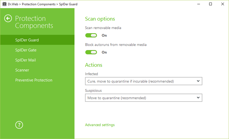 Comprehensive anti-virus security solution for your Windows PC. Real time protection. Installation and operation in an infected system and exceptional resistance to viruses. Efficient detection and neutralization of all types of threats. Fast multi-thread scanning powered by multi-core systems. Protection from latest malicious programs designed to bypass detection by traditional signature-based scan and heuristic analysis. Protection of data against corruption. Comprehensive analysis of packed threats. Scan of archived files at any nesting level. Best detection and neutralization of complex viruses. Filters spam and other types of unsolicited messages without training the anti-spam. Real time scanning of traffic on all ports. With secure search, Google, Yandex, Yahoo!, Bing and Rambler will only return links to content considered safe by the search engines – unsafe content is filtered out by the search engines! Secure communication – instant messenger traffic filtering. Efficient protection of children against exposure to objectionable content. Prevent unauthorized use of removable devices and the computer. Dr.Web Cloud – check URLs on Doctor Web’s servers. Protects against unauthorized access by a network; prevents data leaks; blocks suspicious connections on package and application layers. Remote administration from other computers in the local network without installing the Dr.Web Control Center.